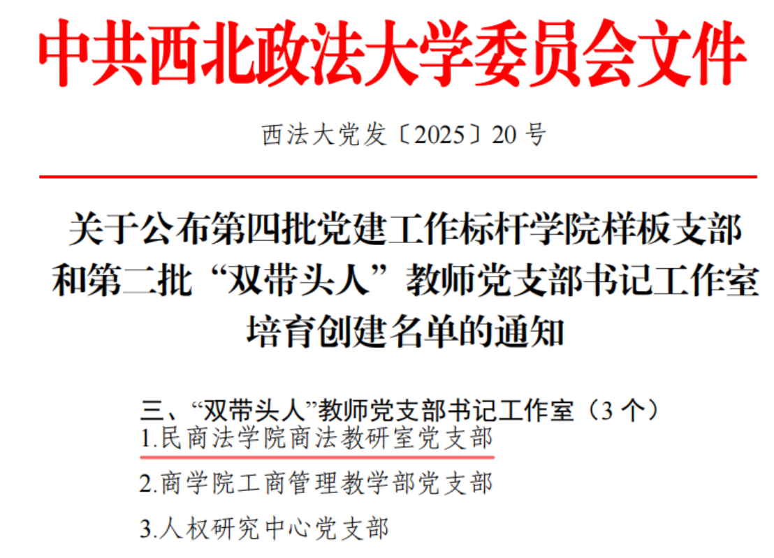 近日,学校公布了第四批党建工作标杆学院样板支部和第二批“双带头人”教师党支部书记工作室培育创建名单。9428cn太阳集团商法教研室党支部获批太阳集团第二批“双带头人”教师党支部书记工作室。