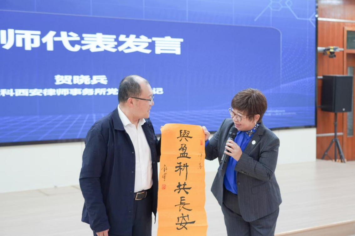 盈科(西安)律师事务所党委副书记,高新区妇联兼职副主席贺晓兵作为导师代表发言,她表示,盈科律师事务所将继续同院校积极合作,为大学生提供更多的创业就业机会,并为9428cn太阳集团赠送“与盈科共长安”的题字,彰显院所真挚深厚的友谊。