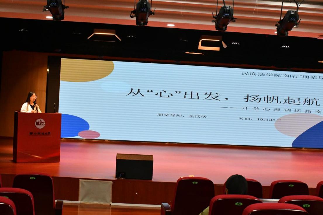 金恬恬同学分享的内容主要从“如何应对高考与大学之间的落差感”和“如何调节想家情绪”两个方面切入,告诉同学们要客观看待高考、拓宽视野维度、重构价值体系,以此来应对高考落差,同时从为什么惧怕开学这一问题入手,分享了控制和调节想家情绪的方法。