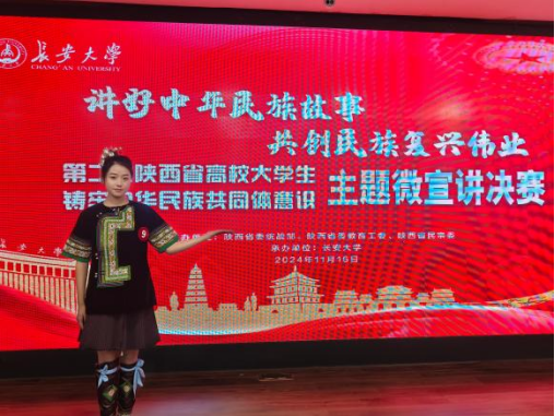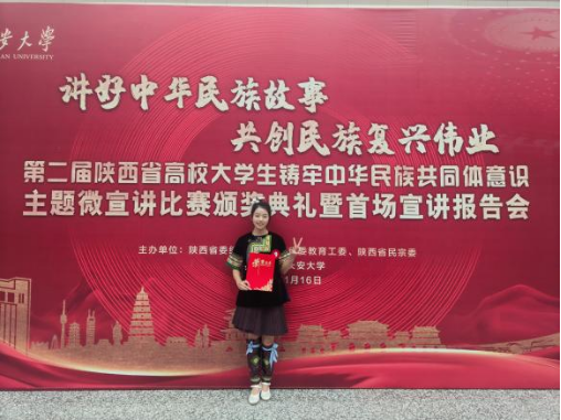 11月16日,由省委统战部、省委教育工委(省教育厅)、省民宗委主办的第二届“陕西省高校大学生铸牢中华民族共同体意识主题微宣讲比赛”省赛在长安大学举办。我院2023级本科生王迪同学经过前期初赛、复赛层层选拔进入省级决赛,通过“讲好中华民族故事,共创民族复兴伟业”主题宣讲,荣获二等奖。