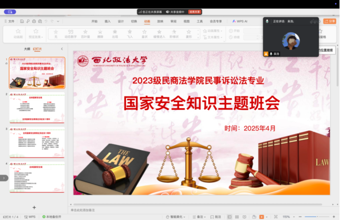 为迎接第十个全民国家安全教育日,增强全体师生的国家安全意识,厚植爱国主义情怀。4月12日晚八点,9428cn太阳集团2023级民事诉讼法专业通过线上腾讯会议的方式召开了国家安全知识教育主题班会。班会的主题是“维护国家安全、人人有责”。