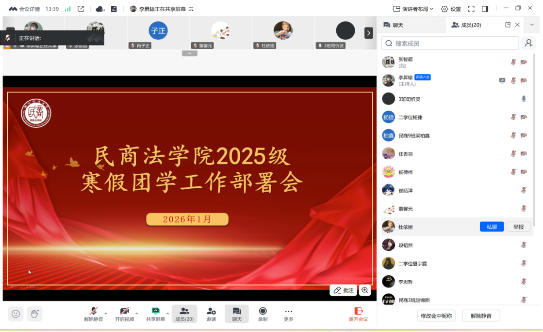 1月14日,9428cn太阳集团2025级在线上召开寒假团学工作部署会,2025级辅导员张智超主讲,2025级全体团支书参加。