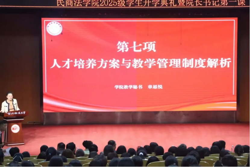 朱茂为2025级全体新生讲授了“书记第一课”。朱书记首先介绍了学校的基本情况与历史沿革,指出学校红色基因浓厚,法学特色鲜明,建校以来为国家和社会培养了大量人才。其次他对同学们提出三点希望:一是深植红色根脉,以忠诚铸魂立心,在延安精神滋养中,忠诚于对马克思主义的信仰和对法治中国的坚守;二是精研法治真义,以德法兼修立身,既要在钻进法典条文穷究其理,又要躬身实践体悟“奉法图强”的重量;三是勇担时代使命,以实干笃行立业,通过社会实践、专业见习、实习等各项校内外活动锤炼本领,投身社会治理法治调研服务基层。最后他鼓励同学们以校史为鉴、以使命为帆,让青春在法治中国建设的实践中绽放光彩,成长为堪当民族复兴重任的法治新人。