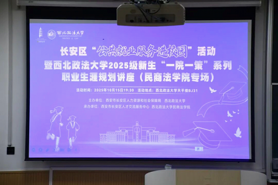 为帮助同学们明确职业方向、科学规划大学生涯,10月15日晚,我院在天平楼BJ31开展2025级新生“一院一策”职业生涯规划讲座。本次活动由西安市长安区人才交流服务中心余洁老师主讲,2025级本科生辅导员张智超老师主持,2025级全体本科生参加。