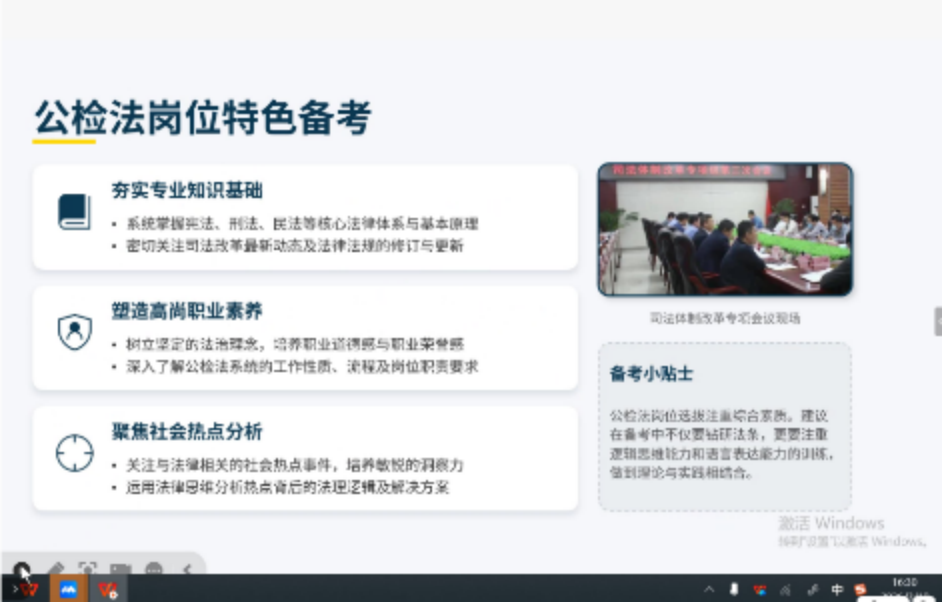 结合法学专业学子的备考特点,冯琳老师给出了针对性极强的备考策略建议。她表示,备考需分阶段有序推进,笔试成绩公布前,要调整好心态,充分利用申论积累的素材和日常热点评论储备,夯实面试基础;成绩公布后,需迅速进入系统性学习,通过大量真题演练,强化答题思路与语言表达能力。同时,她建议同学们在备考中坚持内外兼修,既要提升答题内容的专业性与深度,也要注重着装、仪态等外在表现,重点关注陕西本地政法类新闻与政策法规,贴合本地考情精准备考。