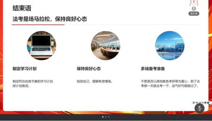 本次法考经验分享会圆满结束,四位学长学姐的经验分享为备考同学理清了思路、注入了信心。愿大家在法考征程中乘风破浪、一举通关!