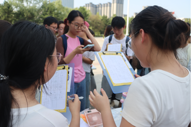 《我画我猜》环节,同学们在白纸前屏息凝神,等待主持人报出题目后飞速作画记录,作答同学时而因生动的绘画而正确抢答,时而因“灵魂画风”而摸不着头脑,引发现场笑声不断。