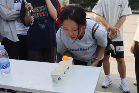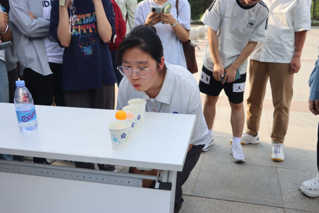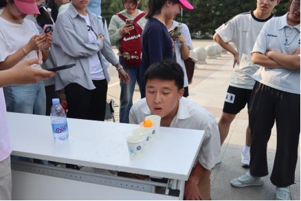 《四渡赤水》接力赛里,4名同学轮流用嘴吹气送乒乓球“跳”过4个盛水纸杯,同学们有的因用力过猛让球“飞”出水杯,有的则能顺利送走乒乓球,现场气氛热闹非凡。