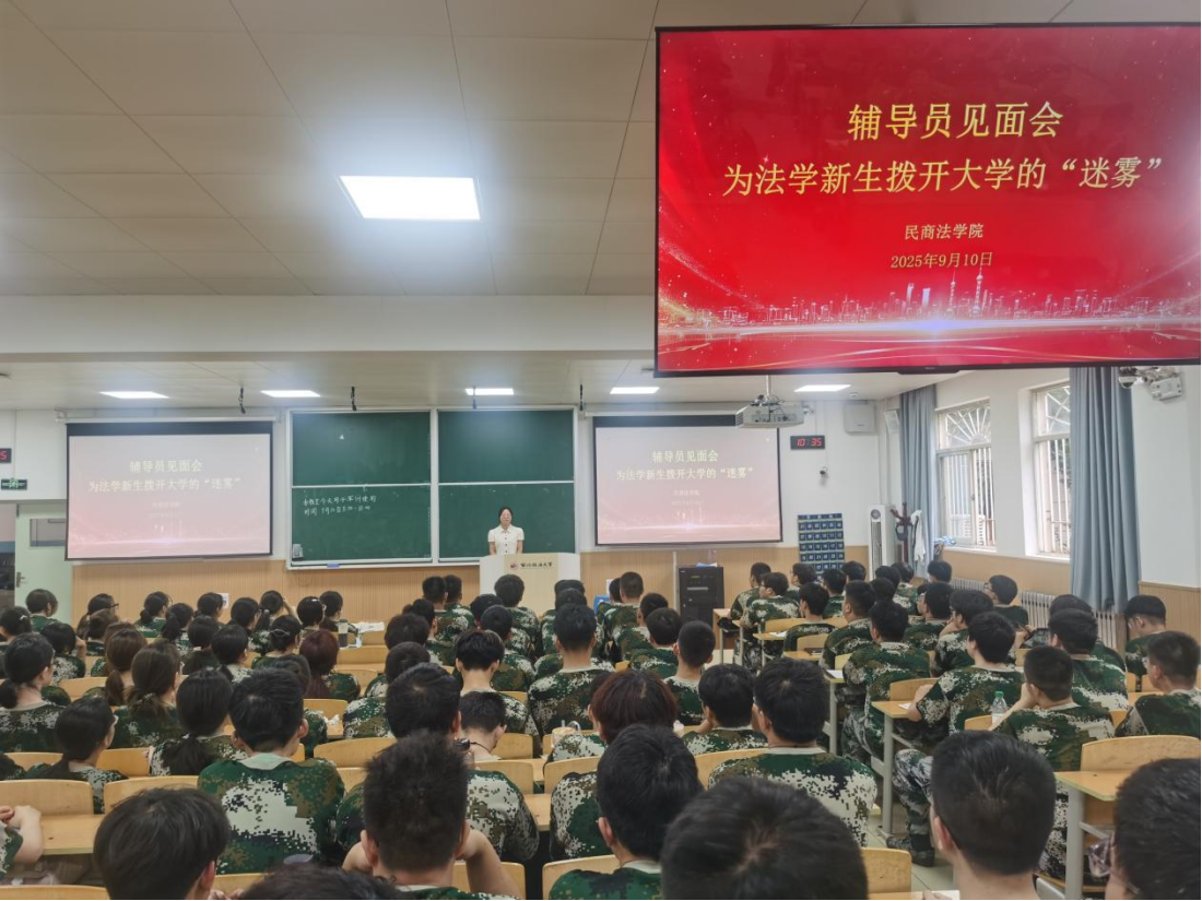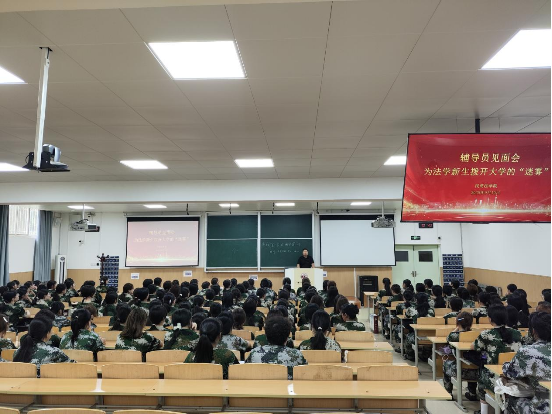 9月10日,我院在天平楼BJ13召开“为法学新生拨开大学的迷雾”辅导员见面会,2025级辅导员丁艳艳、张智超及全体新生参会。