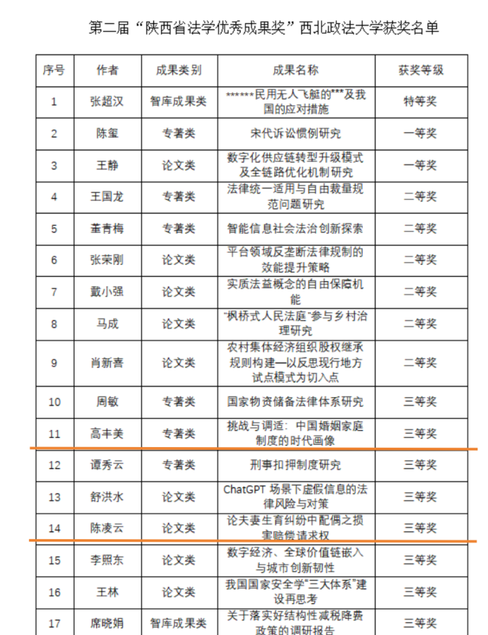 “陕西省法学优秀成果奖”是由陕西省法学会组织评选,是全省法学研究领域的重要奖项。此次获奖成果既展现了我院教师在法学领域的深入研究与创新能力,同时体现了我院持续推进系统性科研建设、支持教师开展高质量研究的积极成效。
