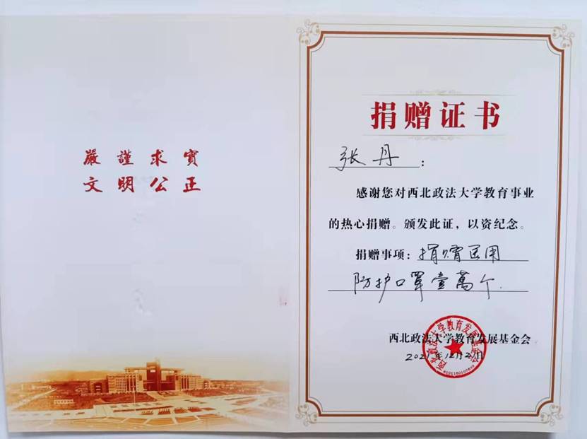 近日,在西安市新冠肺炎疫情防控的关键时刻,全校师生众志成城共同抗疫之际,我院2015届民商法学专业研究生张丹向学院捐赠防疫口罩1万只,以实际行动助力学校疫情防控工作,为学校师生身体健康保驾护航。