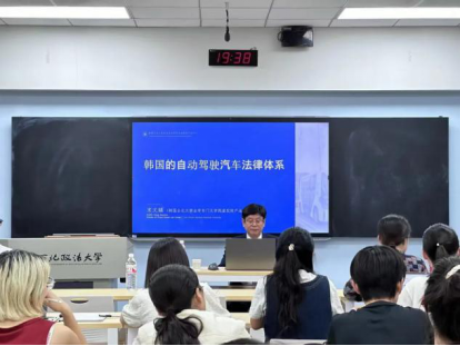 2024年8月28日,韩国全北大学教授、东北亚法研究所虚拟财产法中心主任宋文镐在雁塔校区为我院师生作题为“韩国自动驾驶汽车法律体系”的学术报告。百晓锋副院长主持本次报告会,全北大学李雄暎研究员担任翻译。