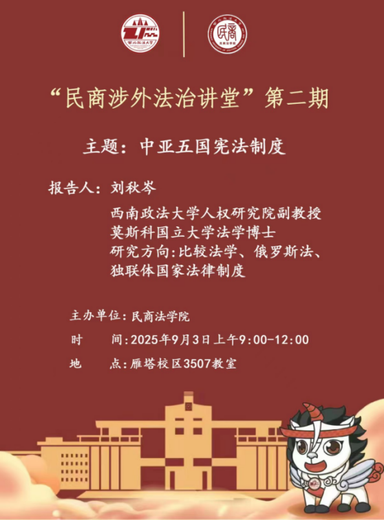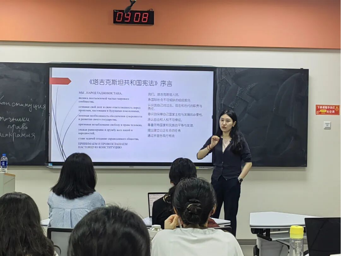 9月3日上午,西南政法大学人权研究院副教授、俄罗斯法研究中心副主任刘秋岑为我院“涉外(俄语国家)民商事法治人才实验班”学员作题为“中亚五国宪法的基本特征与发展方向”的专题讲座。讲座由副院长百晓锋主持。